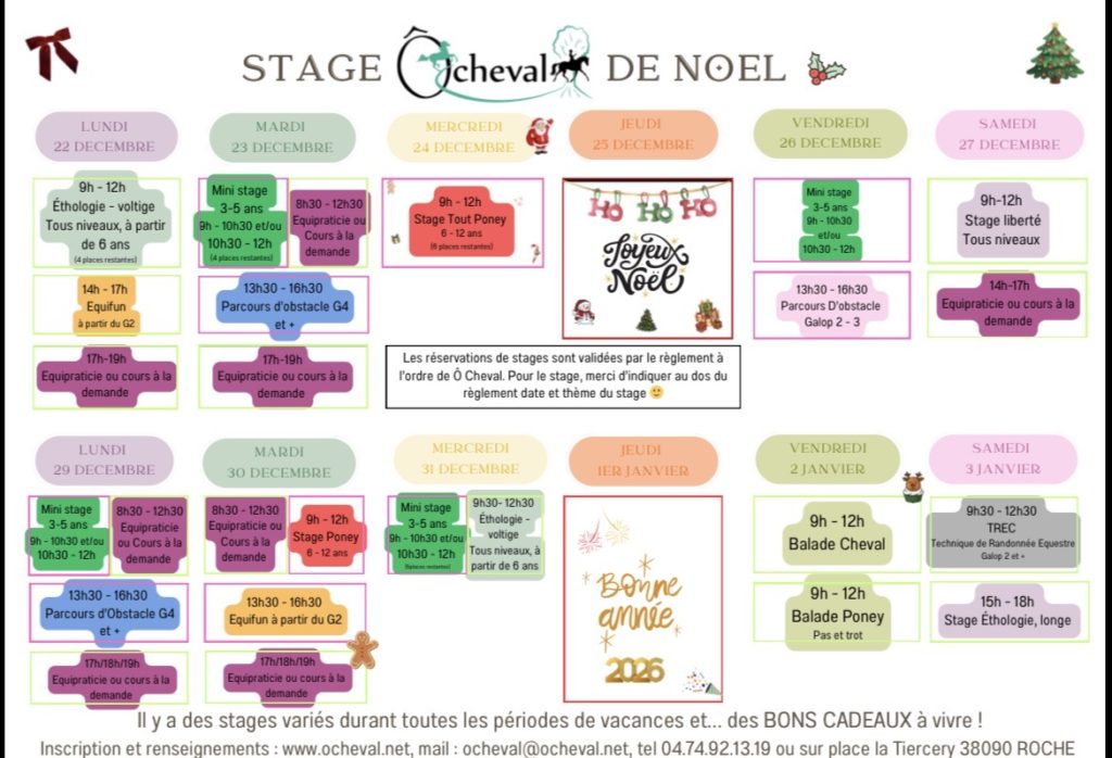 Stages de Noël, d’Hiver et Printemps en ligne, onglet stages de Noël et 2026 . Les dates des stages exazen de l’année ( préparation et présentation des galops 1 à 7), les théâtréquitations et la grande rando de l’été sont fixés et les inscriptions ouvertes. Et bien sûr il y aura aussi poney-randonnée, initiation, balade, équifun et nouveauté stage équi-logique et d’équitation Alexander 😉