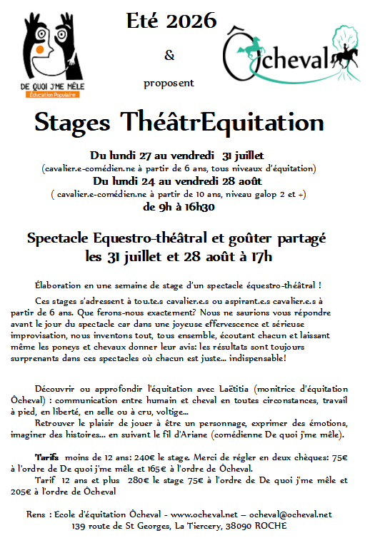 Eté: stages variés tous âges en demi-journée, journée et semaine et Stages Exazen pour le galop 1, 2, 3, 4, 5 ,6 et 7.