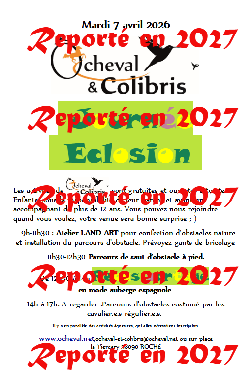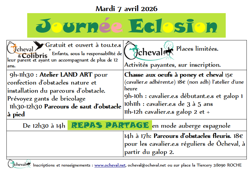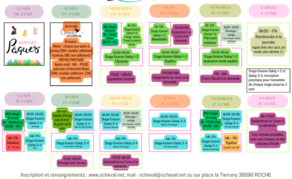 Stages de Noël, d’Hiver et Printemps en ligne, onglet stages de Noël et 2026 . Les dates des stages exazen de l’année ( préparation et présentation des galops 1 à 7), les théâtréquitations et la grande rando de l’été sont fixés et les inscriptions ouvertes. Et bien sûr il y aura aussi poney-randonnée, initiation, balade, équifun et nouveauté stage équi-logique et d’équitation Alexander 😉