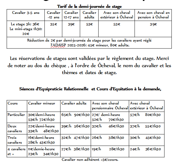 Pour les stages en demi-journée en cas d’inscription insuffisante ( moins de quatre cavalier.e.s) nous commençons le stage à l’heure prévue mais pour le même tarif la durée sera différente : 1 participant.e : 1 heure de cours particulier 2 participant.e.s : 1h30 de cours à 2 3 participant.e.s : 2h de cours à 3 4 participant.e.s et plus : 3h