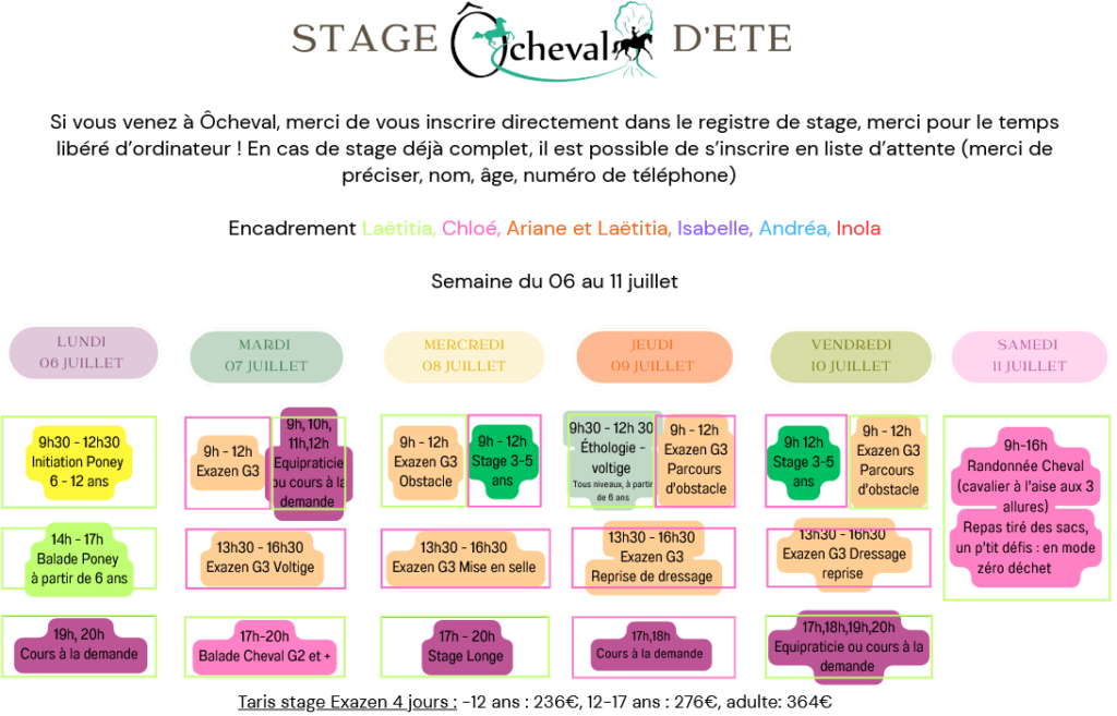 Nous avons à cœur de proposer des activités qualitatives, collectives saines et en sécurité. au vu de la fluctuation des inscriptions, nous adaptons ainsi nos pratiques mais si Ôcheval vous plaît, n’hésitez pas à venir en joyeuse compagnie parce que « Tout seul on va (peut-être) plus vite, mais ensemble, on va (tellement mieux et…) plus loin »