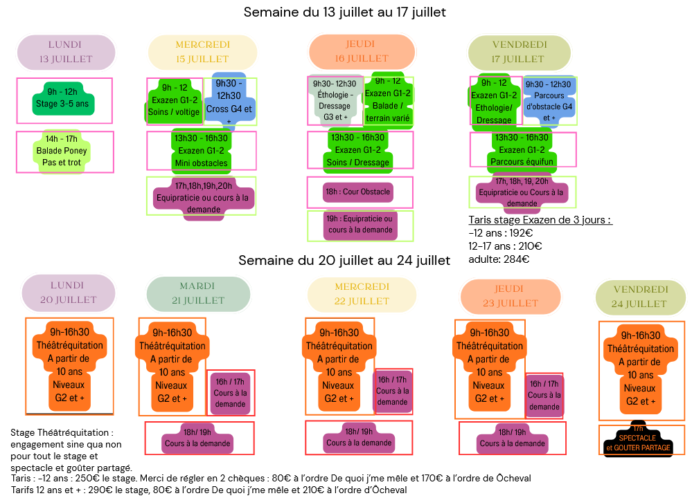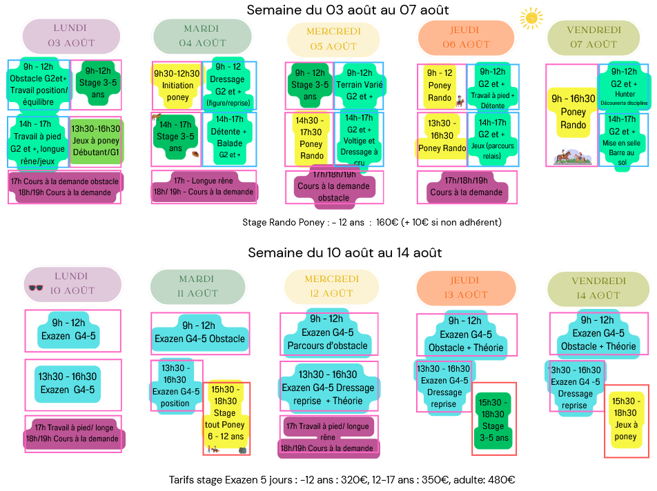 Les stages exazen ont pour objet, en suivant la progression pédagogique proposée par la FFE (Fédération Français d’Equitation), de préparer aux examens fédéraux d’équitation, les GALOPS de CAVALIER.E. Les stages se déroulent, selon les niveaux sur deux à cinq journées. Il y a évaluation accompagnement tout au long du stage et plus formelle en fin de stage avec, pour chaque niveau réalisation de parcours.