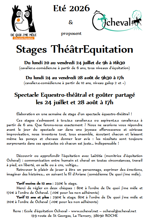 Stages de Noël, d’Hiver et Printemps en ligne, ainsi que les stages exazen de l’année ( préparation et présentation des galops 1 à 7), les théâtréquitations et la grande rando de l’été. Et bien sûr il y aura aussi poney-randonnée, initiation, balade, équifun et nouveauté stage équi-logique et d’équitation Alexander 😉